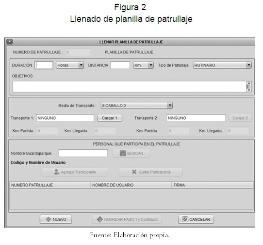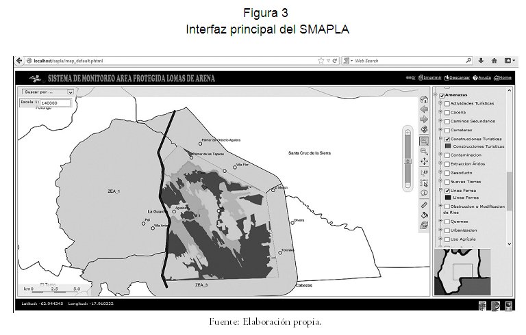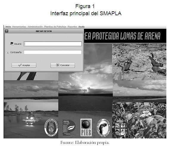 El Sistema de Monitoreo Espacial del Área Protegida Lomas de Arena (SMAPLA) ha seguido la metodología de Proceso Unificado de Desarrollo de Software PUDS (Booch, 1999). El diseño del sistema se ha desarrollado en coordinación con la Dirección del Área Protegida, el equipo de protección del parque y personal indicado de la misma Dirección de Áreas Protegidas del Departamento. En este proceso, se han identificado variables a ser consideradas por los administradores para tomar decisiones oportunas, mejorar la gestión y garantizar el cumplimiento de los objetivos de creación del parque. El sistema de monitoreo está diseñado para: conocer el estado de conservación de los recursos naturales (coberturas naturales y objetos de conservación), determinar el comportamiento de las presiones sobre el área protegida, generar información y reportes para orientar la gestión del área protegida. Además de abordar elementos del plan de protección y vigilancia del parque.
