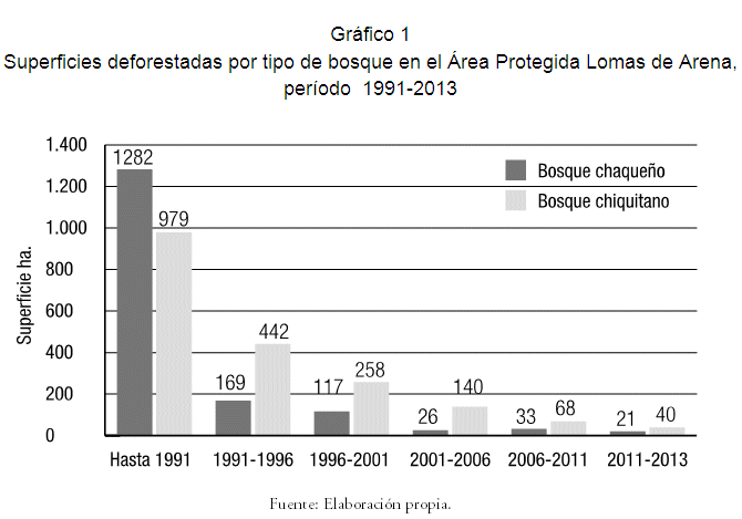 Con base en el análisis de imágenes satelitales Landsat 5 TM y LISS 3 al 2013 (gráfico 1), se determinó que la deforestación total en el Área Protegida Lomas de Arena ha sido de 3.575 ha (36,52%) de los bosques que existían originalmente en el área, los cuales abarcaban 9.790 has (5.693 has de bosque chaqueño y 4.097 de bosque chiquitano). Analizando esta deforestación por tipos de bosque, se observa que se deforestó el 28,95% (1.648 ha) del total de bosque chaqueño y el 47,04% (1.927 ha) del bosque chiquitano. Haciendo un análisis de los cambios ocurridos en los últimos 22 años (1991-2013), se ha observado que se deforestaron 1.314 hectáreas de bosque, lo que representa un 13,42% del total de  bosques  del  Área Protegida Lomas de Arena; la deforestación ocurrida en este periodo ha sido de 6,43 % (366 ha) del bosque chaqueño y un 23,14% (948 ha) del bosque chiquitano. Se observa por tanto que el bosque chaqueño es el que se encuentra mejor conservado en el área protegida y que el bosque chiquitano requiere de mayor atención, toda vez que hasta 2013 se ha perdido cerca del 50% de este tipo de vegetación al interior del parque, es decir sigue siendo este tipo de vegetación la más susceptible a su fragmentación vinculada a actividades agrícolas-ganaderas.