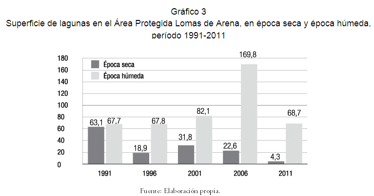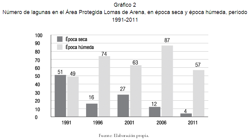 En el año 1991, en época seca, se podía observar la existencia de las lagunas principales, asociadas a las dunas; comparando con lo que permanecía de ellas en época seca para el año 2011 es notoria la disminución de los cuerpos de agua. Así también, en época húmeda, en el año 1991 se observa la existencia de una mayor cantidad de lagunas y de mayor extensión que en el año 2011, según gráficos.