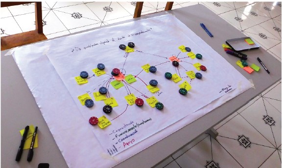 Actors were placed on the chart and connected with colored lines to represent their relationships. We use a flexible participatory approach to discuss the mapping process, positions and linkages were corrected according to the narratives. The links indicated the type of support provided, such as training, financing, information flows, and family involvement in business and childcare. Exploratory questions were introduced to deepen the analysis, including discussions about the roles and support provided by family members and institutions. Participants assigned a score to each actor’s influence on a scale of 1 to 5, allowing the measurement of perceived influence within the networks and facilitating discussions on empowerment.