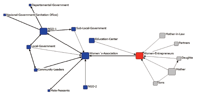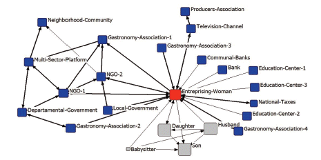 Self-motivated women who initiated contact with an entrepreneur’s network were more likely to participate in other institutional networks, showing and affiliative behavior. Figure 3 shows that the entrepreneurial woman is linked to four different ‘associations’ comprising men and women and to a social structure with higher incidence levels - as opposed to rural networks - ties in self-motivated entrepreneurs are based on instrumental support.