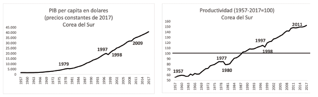 Figura 1. PIB per cápita y productividad en Corea del Sur 1957-2017