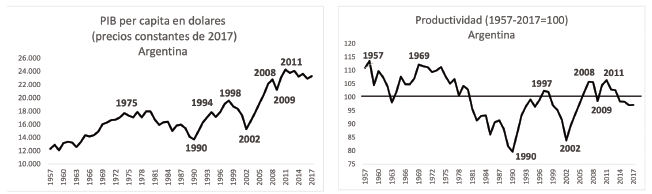 Figura 2. PIB per cápita y productividad en Argentina 1957-2017