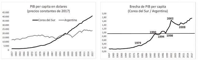 Tomando datos del Fondo Monetario Internacional, en 2017 (véase la Tabla 1), el ingreso per cápita a PPP (Purchasing Power Parity) en Corea del Sur era de US$37.725 mientras que en Argentina era de US$16.771. La brecha entre ambos países es de 2,2 (37.725/16.771).