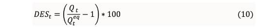 Se define al desalineamiento del TCR (DESt) cómo el desvío porcentual entre el TCRO y el TCRE de mediano/largo plazo con base en 2007 Qt eq, expresado en la ecuación (10):