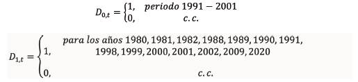 Para implementar la técnica de cointegración ARDL se sigue la notación de Pesaran et al. (2001). Se incluyeron 2 variables dummy para tener en cuenta, por un lado, el efecto de la década de la Convertibilidad (D0,t), y por otro lado, para tener en cuenta el efecto de algunas2 recesiones económicas experimentadas durante el periodo (D1,t) de la siguiente forma: