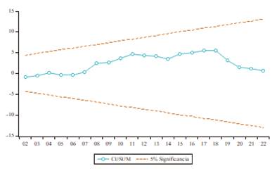 Posteriormente, se testearon los diagnósticos de consistencia, que incluyeron pruebas de normalidad de residuos, heteroscedasticidad, correlación serial y la prueba RESET de Ramsey, así como también las pruebas de estabilidad dada por las pruebas CUSUM y CUSUM de cuadrados. Los resultados presentados en la Tabla 3, y las Figuras 1 y 2 permiten confirmar que el modelo pasa exitosamente todas las pruebas. En consecuencia, el modelo es consistente y estable.