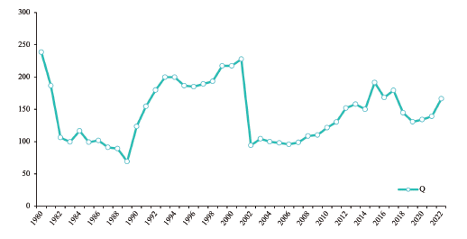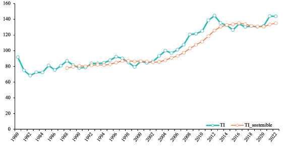 La dinámica del TCRE muestra una tendencia decreciente entre 1988 y 2022, es decir, que se fue depreciando año tras año (Figura 3). Durante este periodo, el TCRE se depreció un 53%, pasando de un valor de 208 en 1988 hacia 98,6 para 2022, con una tasa promedio anual de depreciación del 2%. Este comportamiento puede explicarse analíticamente a partir de la evolución de los fundamentales sostenibles, particularmente del incremento notable de los términos de intercambio (ver Figuras C2.1 a C5.1).