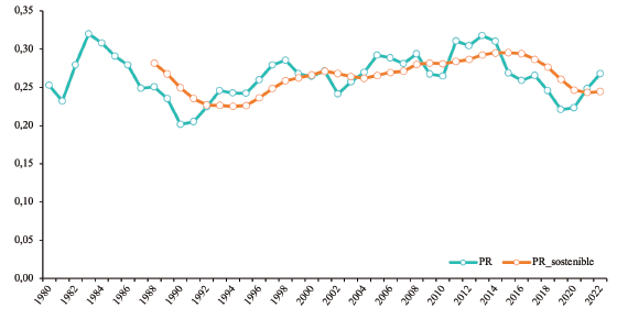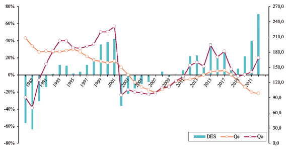 Como consecuencia de todo este análisis, se podría decir que el abrupto atraso cambiario obtenido del ARS desde 2019 sería una señal de alerta para la economía argentina (ver Figura 4). Esta sobrevaluación que alcanzó el 71% para 2022, y que fue el máximo valor obtenido de atraso cambiario en toda la muestra indicaría que, si en un hipotético caso el gobierno hubiese decidido liberar el mercado de cambios hacia 2023, muy probablemente la corrección del TCRO hacia su nivel de equilibrio hubiese conllevado enormes costos económicos como en el pasado, o quizás mucho mayores por la magnitud de la distorsión encontrada del TCRO.