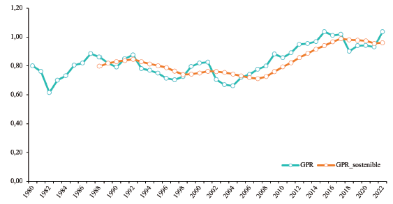 Después GPRt es el gasto público relativo del país doméstico sobre el extranjero donde Aguirre y Calderón (2005) establece que si se asume que el gasto público está más sesgado hacia los bienes no transables, un aumento del consumo público afectará negativamente la demanda del sector no transable, aumentando así su precio y generando una apreciación del TCR, por lo que β3 > 0.