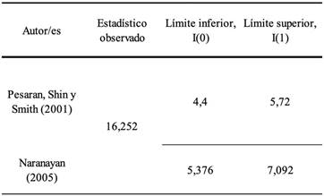 Nota. Los valores de Pesaran, Shin y Smith (2001) están calculados para una muestra n = 1000, mientras que los valores de Narayan (2005) lo están para una muestra n = 40.* Los límites son tomados a la significancia estadística del 1%.