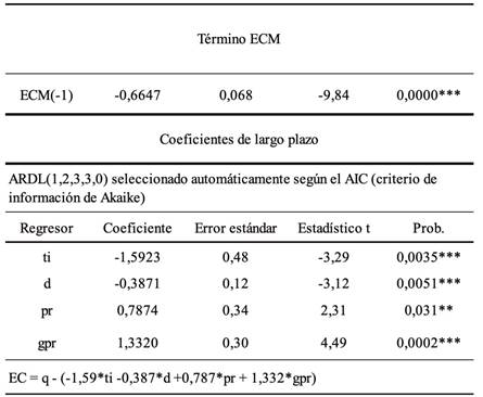 Los resultados de la Tabla 4 muestran que el coeficiente estimado para la velocidad de ajuste del modelo ECM(-1) estadísticamente significativo, negativo y menor a 1 asegurando así la convergencia del modelo. Esto implica que aproximadamente el 66,4% de los movimientos de desequilibrio se corrigen en un periodo. A su vez, en la Tabla 4 se presenta la estimación de los coeficientes de la dinámica de largo plazo6: