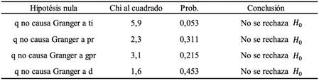 Nota. Para estimar cada relación, se estimó un modelo VAR aumentado (k + dmax), donde es el rezago temporal óptimo del VAR, y el orden integrado máximo de las variables del sistema. En este caso, dmax=1 y k=2 seleccionado de acuerdo al cumplimiento estabilidad y ausencia de correlación serial del modelo VAR.
