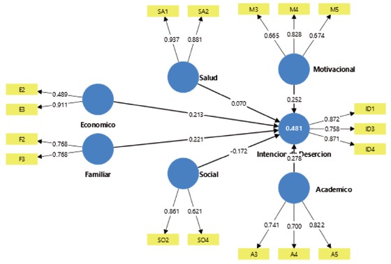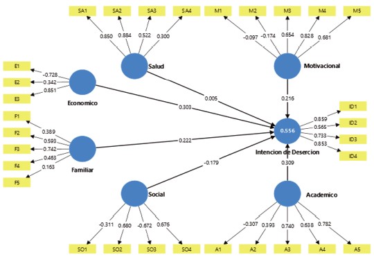 El modelo estructural se construyó con el objetivo de evaluar la fiabilidad y validez de los constructos teóricos propuestos, permitiendo estimar el peso e influencia de cada variable latente sobre la intención de deserción estudiantil. La Figura 1 mostró la representación gráfica del modelo inicial, en la que se visualizaron las relaciones entre las variables latentes y sus respectivos indicadores.