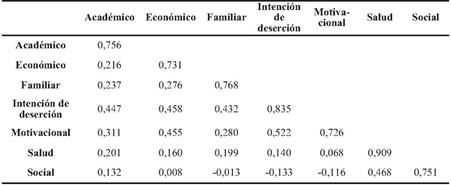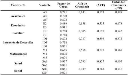El análisis de validez y confiabilidad del modelo confirmó que los constructos académico, económico, familiar y motivacional ejercen una influencia significativa en la intención de deserción en los estudiantes de la carrera de Ingeniería Comercial de la Universidad Autónoma Tomás Frías. Mediante el proceso de validación, se identificó que ciertos ítems dentro de cada factor presentaron un peso diferencial sobre la variable dependiente, principalmente relacionados con las dificultades académicas, la necesidad de empleo, los conflictos familiares y la motivación estudiantil. Estos resultados reflejan la complejidad multifactorial de la deserción y destacan la importancia de atender simultáneamente dimensiones académicas, económicas, familiares y motivacionales para reducirla.