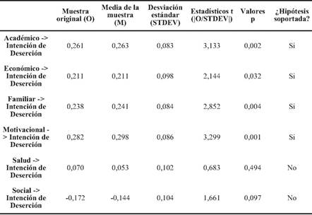 Siguiendo el criterio de Cabero-Almenara et al., (2022) una relación se considera estadísticamente significativa cuando p < 0,05. El análisis de bootstrapping (Tabla 4) permitió contrastar las seis hipótesis del modelo estructural, revelando convergencias y divergencias respecto a la literatura científica sobre deserción universitaria.