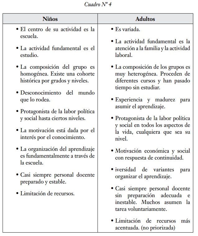 En toda esta diversidad hay un aspecto más a tener en cuenta. Durante los últimos años se ha impuesto en el carácter masivo de la educación de adultos, sobre todo en los procesos de alfabetización y su continuidad, la educación básica elemental, llamada también postalfabetización, aunque este último término está cuestionado por muchos conocedores de la educación, por considerar que la alfabetización no es más que un primer nivel de la enseñanza elemental y que cuando se concibe la alfabetización debe concebirse también su continuidad y no como algo a posteriori, concepción esta con la que, en el marco de este artículo, estamos totalmente de acuerdo.