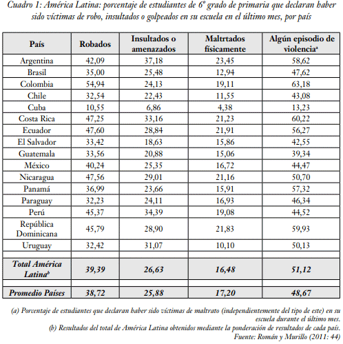 La investigación realizada por Román y Murillo (2011) nos presenta un panorama regional de las diversas manifestaciones de violencia escolar en las escuelas latinoamericanas; mediante un análisis comparativo a 2.969 escuelas, 3.903 aulas y 91.223 estudiantes de 6° grado de 16 países latinoamericanos -entre ellos: Argentina, Brasil, Colombia, Costa Rica, Cuba, Chile, Ecuador, El Salvador, Guatemala, México, Nicaragua, Panamá, Paraguay, Perú, República Dominicana y Uruguay-, se llega a los siguientes datos