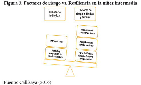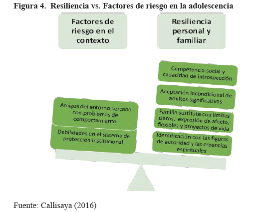 Y, como factores protección: "un atributo o característica individual condición situacional y /o contexto ambiental, que inhibe, reduce o atenúa la probabilidad de afectación e incrementa la capacidad resiliente según Clayton (1992), en M.I.D. (2003). En ese entendido parafraseando a Lara et. al. (2000) el niño/a o adolescente resiliente posee cualidades personales, capacidad de adaptación a los diferentes contextos, vínculos afectivos de calidad y capacidad de construir todo ello con los adultos responsables (padre y madre sustituta).