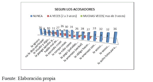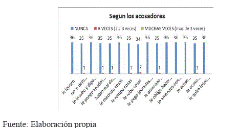 Según la victimas un 33% mencionan que "Nunca" lo ignoran sus compañeros, pero un 3% de los estudiantes mencionan que "A veces" lo ignoran sus compañeros de curso. Por otro lado, los acosadores con un 24% de los alumnos/as mencionan que "Nunca" agredieron verbalmente con insultos al compañero de su curso pero un 20% de los estudiantes "A veces" insultan a sus compañeros con groserías.