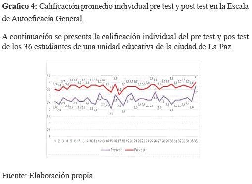 Se observa que en promedio subió el nivel de autoeficacia de los 36 alumnos participantes del primero de secundaria "A" en un caso alcanzó la máxima puntuación en el alumno número 36 incremento de 3,7 a 4.