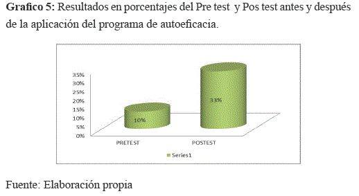 En el gráfico N°5 se observa que en el pre test se obtuvo un nivel bajo del 10% en la escala de autoeficacia general, que se aplicó a los alumnos/as del primero de secundaria "A" se evidencia que el programa de autoeficacia fue efectivo incrementándose a 33% en el post test.