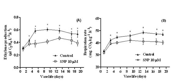 Figure 4 Changes of ethylene production (A) and respiration rate (B) of Dendrobium ‘Planty Fushia’ inflorescences treated with 10 µM of SNP in the vase solution (ð) and distilled water (control) (▲) during their vase life at 23±2 °C. All values are means ±SE of three replications and asterisks indicate significant differences between treatments at the Duncan's Multiple Range Test (DMRT) at 5% level