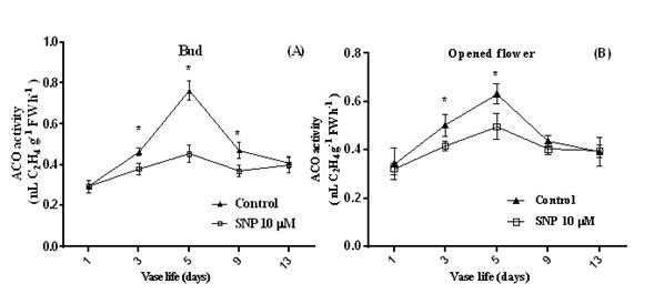 Effect of SNP on ACC synthase and ACC oxidase activities. The ACC synthase (Figure 6) and ACC oxidase (Figure 7) activities of both SNP-treated and control at buds and open flowers tended to increase up to day 5 and then decrease. The activities of both enzymes in both floral stages were higher in the control than in those treated with SNP. ACC synthase and ACC oxidase activities deal with the capacity to convert ACC to ethylene were determined in SNP-treated cut flowers in floral buds and open flowers, delayed the rise in (and reduced the maximum of) ACC synthase and ACC oxidase activities in open flowers, and buds (Figures 6 and 7). According to our result (Figure 6B), SNP had a better effect on ACS activity in open flowers than buds so the trend of ACS activity slightly increased during vase life. Further, inflorescences treated with SNP (Figure 7A) in buds declared lower quantity and smooth increase in ACO activity than open flowers.