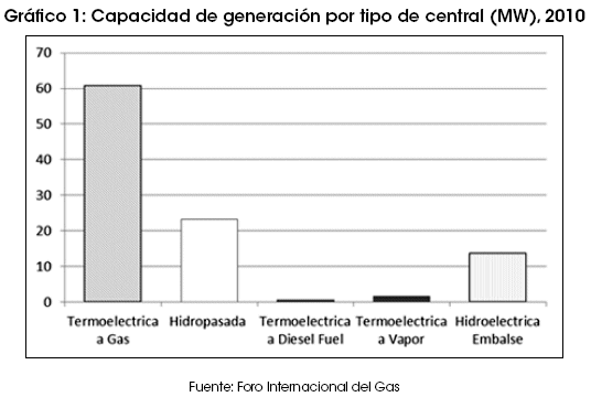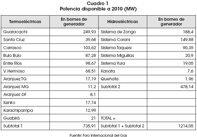 En el Cuadro 1 se detallan las centrales hidroeléctricas y termoeléctricas existentes y la potencia que inyectaron durante el año 2010 al SIN. Siendo la generación termoeléctrica a gas la de mayor importancia, el resto de la generación termoeléctrica utiliza como fuente biomasa como el azúcar (caso Central Guabirá), y las unidades de dual fuel que combinan diesel con gas natural (caso Aranjuez).