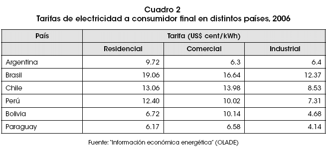 Y de hecho, gracias a este subsidio, Bolivia goza de una de las tarifas de electricidad a consumidor final más bajas de la región. El Cuadro 2 permite observar las tarifas de electricidad de algunos países sudamericanos para la gestión 2006. Por ejemplo, la tarifa residencial era de 6.72 US$ cent/kWh, muy inferior a las tarifas de Brasil, con 19.06 US$ cent/kWh, y chile, con 13.06 US$ cent/kWh, y en general al promedio ponderado en ALyC, de 11.5 US$ por kWh.
