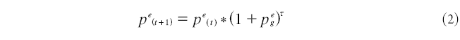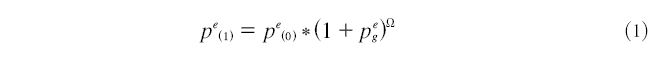 La siguiente ecuación define el precio de la electricidad para el primer período de simulación, tal que la misma crece respecto a un precio inicial de un año-base a una tasa de crecimiento promedio para el período Ω. Esta tasa de crecimiento refleja en el corto plazo variaciones en la tasa de consumo de la energía eléctrica.