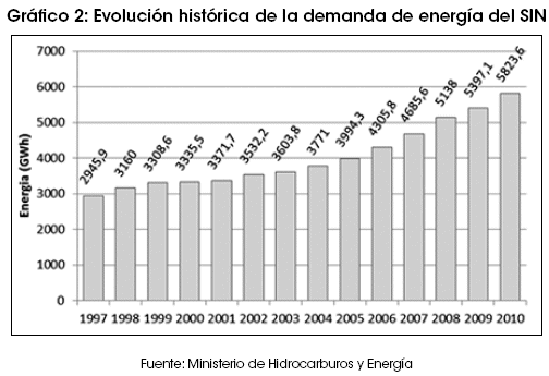 La demanda del SIN está compuesta por la demanda de los consumidores regulados, que son atendidos por las empresas de distribución y por la demanda de los consumidores no regulados. El Gráfico 2 muestra la evolución histórica de la demanda de energía del SIN entre los años 1997 y 2010; en dicho periodo el promedio de crecimiento fue de 5.7%. Para el año 2011 se estima que la demanda llegara a 6.245 GWh2, alcanzando un crecimiento de 7.0% respecto del 2010.