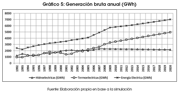 Según la simulación, la termoelectricidad a partir del año 2005 modifica la estructura de la matriz secundaria de energía. El modelo determina una tasa de crecimiento de la termoelectricidad de 3.5% al año sostenida al 2020, y una tasa de crecimiento negativo de la hidrogeneración de 0.04% sostenida al 2020, que determina un cambio en la estructura de la matriz de 30% de hidroelectricidad y 70% en el 2020 (véase Gráfico 5).