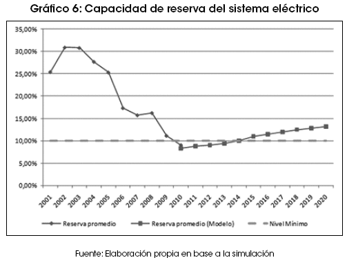 Finalmente, para el adecuado funcionamiento del sector eléctrico se requiere un balance demanda/oferta, que implica un nivel de reserva (margen de capacidad) requerido para lograr un nivel de confiabilidad y seguridad de servicio deseadas. Siguiendo a Gomes (2010), el nivel mínimo de reserva del sistema es de 10%. En el país, el margen de reserva se redujo gradualmente hasta alcanzar niveles promedio inferiores al 10% a partir de 20104. Como se observa en el Grafico 6, el modelo predijo para 2010 un margen de reserva ligeramente inferior al reportado en la realidad, y es de esperar que la senda de recuperación sobre el mínimo sea antes de lo predicho por el modelo en 2014.