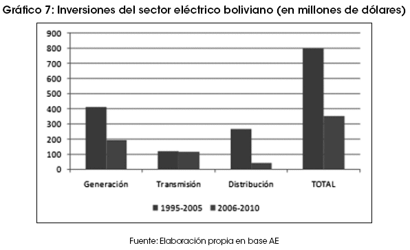 Complementando la explicación, entre 1995 y 2005 se invirtieron 800 millones de dólares americanos en el sector eléctrico, de los cuales la mitad fue destinada a la generación eléctrica, mientras que en el período 2006-2009 el total invertido se redujo notablemente, particularmente en el sector de generación. En el año 2010 se percibe un repunte de las inversiones en generación, debido a la instalación de generadores termoeléctricos en Entre Ríos y 69.3 millones de US$ en la instalación de un ciclo combinado en Guaracachi (véase Gráfico 7).
