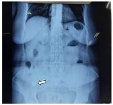 Figura 1 Rayos X de abdomen donde se evidencia imagen radiolucida (lito) en fosa iliaca derecha (flecha blanca indica el lito).