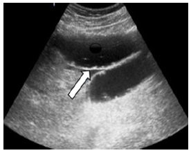 Figura 2b Tomografía de abdomen en la cual la flecha blanda indica presencia de lito, indicada por la flecha blanca.