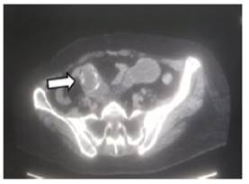 Paciente femenino de 68 años de edad, dentro sus antecedentes patológicos quirúrgicos, refiere apendicectomía convencional hace 40 años y clínicos una diabetes mellitus en tratamiento; cuadro clínico de 1 semana de evolución caracterizado por presentar, dolor abdominal tipo cólico generalizado, nauseas que llegan al vomito en varias oportunidades tipo bilioso, distensión abdominal; por lo que acude a una clínica particular donde es internado por 4 días y manejado con medicamentos que no refiere; en forma posterior solicita el alta hospitalaria, por lo que acude a nuestra institución. Al momento de su evaluación presentaba vómitos fecaloideos en varias oportunidades; signos vitales estables. Al examen físico segmentario; cardiopulmonar clínicamente estable; abdomen con leve distensión a expensas de gases, ruidos hidroaéreos positivos pero hipoactivos, dolor a la palpación profunda en epigastrio e hipogastrio, resto de examen sin particular. Se realizaron los exámenes complementarios correspondientes: Laboratorios. GB:18 160 109/L, segmentados 88 %, TP 12 segundos, INR 1,17, hemoglobina 13.2 gr/ dl, Plaquetas 463 000 109/L. Rayos X de abdomen (Figura 1), se puede observar imagen radiolucida en fosa iliaca derecha.