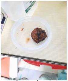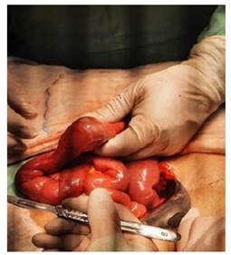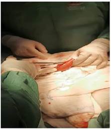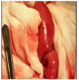 El procedimiento se realiza bajo anestesia general, paciente en posición decúbito dorsal, se decide realizar una incisión en línea media supra e infraumbilical, se procede a explorar cavidad, se localiza sitio de obstrucción a 50 cm de ángulo de Treizt; los hallazgos demuestran un cálculo de más o menos 4 x 5 cm impactado en yeyuno, a 50 cm de ángulo de Treizt, asas intestinales dilatadas a proximal; se realiza una laparotomía exploradora, enterotomía, extracción de cálculo, enterorrafia, lavado y drenaje de cavidad. Diagnostico post operatorio de obstrucción intestinal alta, Ileo biliar, Síndrome de Mirizzi grado Vb (Figura 3a, b, c d).