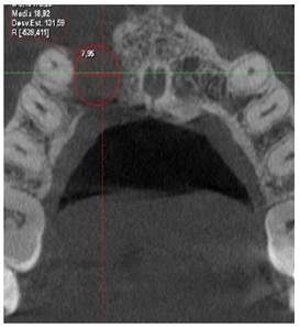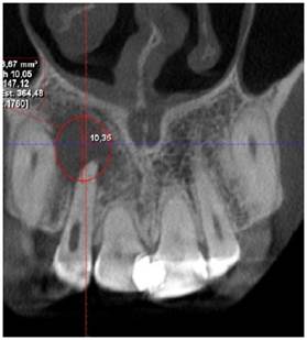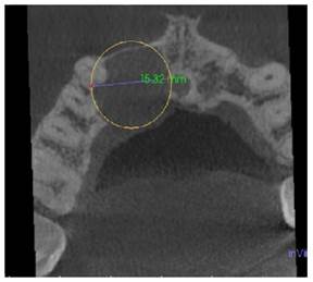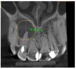 A la Tomografía computarizada de haz cónico (CBCT) se observó una imagen hipodensa que se extendía desde la pieza 1.1, 1.2, 1.3 hasta la pieza 1.4 extendiéndose principalmente hacia el paladar, en el cual se observa perdida de continuidad, las dimensiones de la lesión fueron de 14,38 mm en sentido longitudinal y 15,32 mm en sentido transversal (Figura 2a, b).