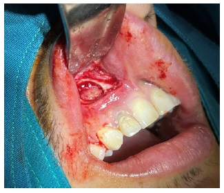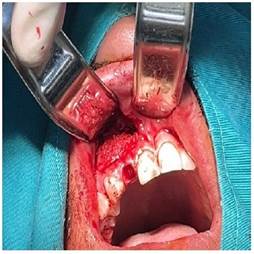 Figura 3b Se retiro la membrana del quiste a nivel de la ventana ósea y se realizó el drenaje del líquido seropurulento, lavamos a través del orificio con suero fisiológico y yodopovidona.