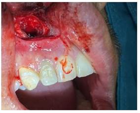 Obteniendo como diagnóstico presuntivo un quiste radicular asociado a la pieza 1.2; se le solicitó al paciente una biometría hemática, con todos los valores dentro de parámetros normales; se realizó el procedimiento quirúrgico de descompresión, por medio de una incisión lineal, el levantamiento del colgajo mucoperiostico y posterior osteotomía a nivel del ápice de la pieza 1.2, hasta descubrir la membrana del quiste (figura 3a), se extiende la ventana con un diámetro de aproximadamente 5 mm compatible con el diámetro del dren que colocaríamos, se realizó una incisión a nivel de la membrana del quiste y se drenó líquido seropurulento, se realiza el lavado mediante el orificio, con suero fisiológico y yodopovidona (Figura 3b).