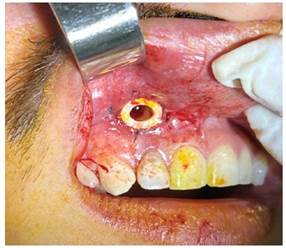 No obstante, no está exenta de desventajas: requiere dos intervenciones; mantenimiento de una cánula durante varios meses con sus irrigaciones correspondientes con digluconato de clorhexidina al 0,12 %, o suero fisiológico y la necesidad de un paciente colaborador para asegurar una buena higiene bucodental y que acuda a las revisiones periódicas para verificar constantemente que la cánula siga permeable1),(2),(8),(17.