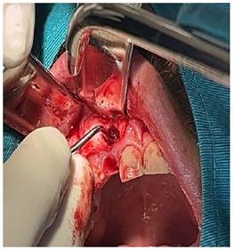 Figura 3a Se observa ventana de 5 mm de diámetro que se realizó mediante osteotomía a nivel del ápice de la pieza 1.2; observamos la membrana del quiste.