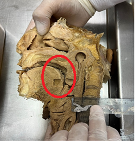Figura 1b: Diámetro transverso laringofaringe 1 milímetro, obsérvese también los cortes realizados para el estudio patológico.