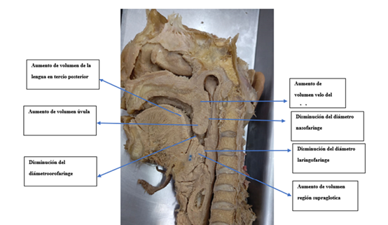 Se realizo una evaluación, basado en disecciones cadavéricas donde se incluyeron 10 piezas anatómicas de cráneo, 8 de ellas de sexo masculino y 2 de sexo femenino, el objetivo era realizar un estudio sistemático de vías aéreas, cavidad nasal, oral, faringe y laringe por medio de cortes sagitales y frontales para visualizar la estructura interna de cada una; es ahí donde se logra observar el engrosamiento notable en úvula, lengua, laringe y glotis en el la pieza cadavérica de este estudio, por lo cual se mandó muestras a patología para su descripción microscópica del tejido, cuyos resultados fueron compatibles con un cuadro crónico de laringe (Tabla 1).
