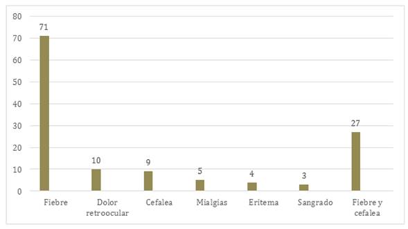 Entre las características ginecológicas y obstétricas, la paridad más frecuente es la primípara, que representa el 26% de los casos. El grupo de edad más común para el diagnóstico de dengue es el de 26 a 30 años, que representa el 40% de los casos. La mayoría de la población (63%) vive en unión estable, y el 75% de los casos proviene de zonas urbanas. El tercer 25% de los casos de dengue, que representó el 47% de los casos y representó la edad gestacional de 36 a 40 semanas, fue el más afectado por la enfermedad (Tabla 1); en la Figura 1 se observan los motivos de consulta más usuales.