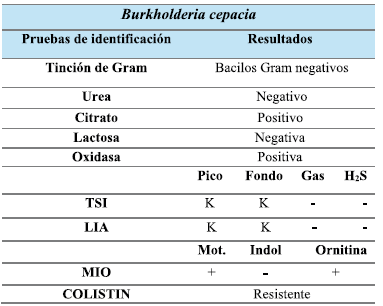 En la Tabla 1 se destacan las pruebas específicas realizadas para identificar la Burkholderia cepacia. Se confirma la presencia de un bacilo gramnegativo, no fermenta lactosa y es resistente a Colistin, características específicas del microorganismo.
