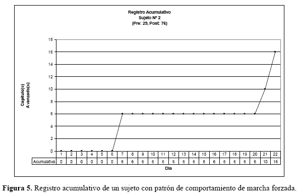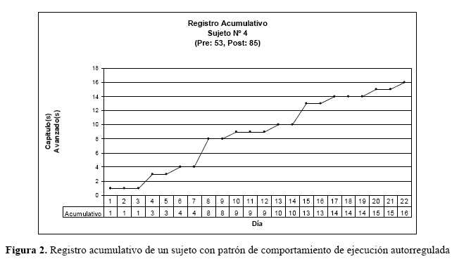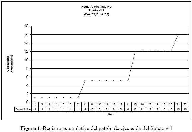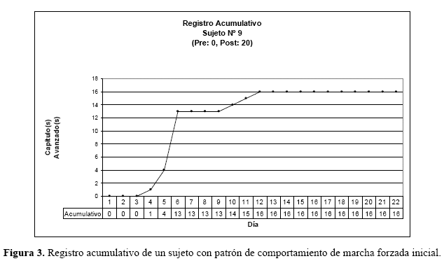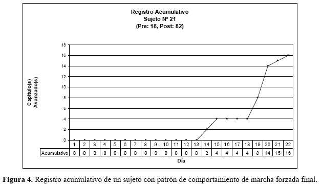 La ejecución de cada uno de los alumnos se expresa del siguiente modo: en un registro de 22 días de duración en el eje de las abscisas (X) y acumulándose cada uno de los 16 capítulos (secciones) completados satisfactoriamente en el eje de las ordenadas (Y). A continuación se presenta un caso graficado bajo esta lógica. El registro acumulativo, permitió identificar la distribución de las ejecuciones de cada sesión de trabajo, de cada uno de los alumnos, de esta manera, se pudo establecer individualmente, el patrón de comportamiento emergente de la interacción con el programa.