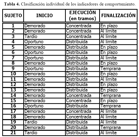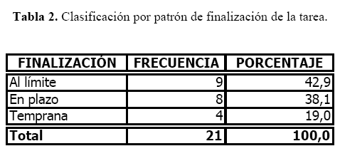 La Tabla 5, muestra que si bien no existe un patrón de comportamiento claramente preponderante en el grupo, sí existe una tendencia a demorar el inicio del trabajo, significando un 75 por ciento de los participantes. Algunos de estos últimos logran distribuir sus ejecuciones en el tiempo restante (42%), mientras que 33 por ciento, opta por trabajar en marcha forzada para cumplir con la tarea, donde siete alumnos coincidieron en ejecuciones prolongadas en pocas sesiones de trabajo.